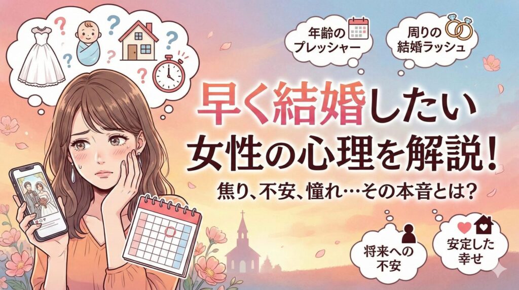 「周りの友人が次々に結婚して焦りを感じる」 「なぜ早く結婚したいと思うのだろう?」 結婚に対する強い憧れや焦りに悩み、自分の気持ちをうまく整理できずに戸惑う人は少なくありません。 焦る気持ちが大きいと空回りしてしまうこともあります。結... -