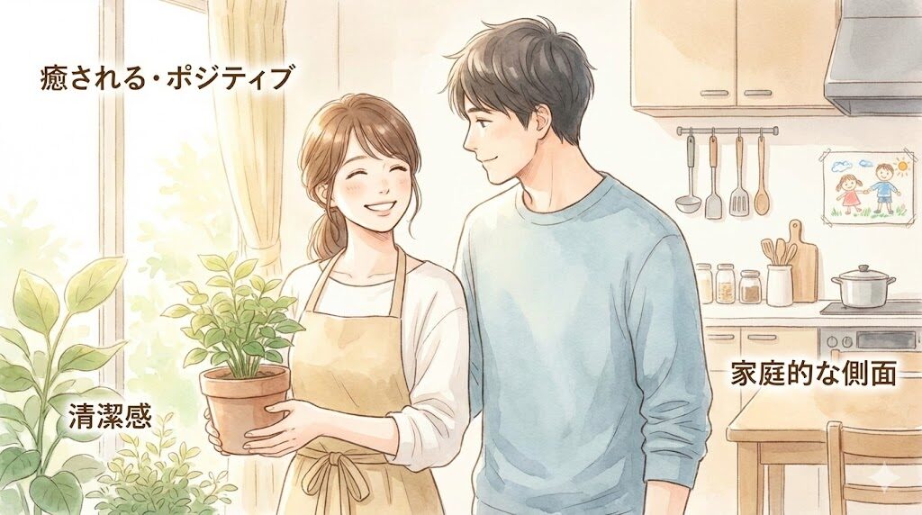 • 男性は「癒やし・清潔感・生活力」のある女性を求めている